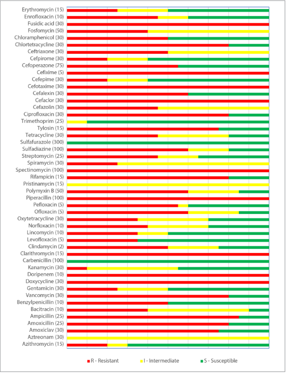 Antibiotic resistance of the microbial cultures was determined by disc diffusion method in accordance with Methodological Guidelines MUK 4.2.1890-04 “Guidelines for susceptibility testing of microorganisms to antibacterial agents”2. Within the research activities, antibacterial drugs of various groups were used (HiMedia Laboratories Pvt Ltd., India): macrolides (azithromycin 15 µg, clarithromycin 15 µg, pristinamycin 15 µg, spiramycin 30 µg, tylosin 15 µg, erythromycin 15 µg), monobactams (aztreonam 30 µg), penicillins (amoxiclav 30 µg, amoxicillin 25 µg, ampicillin 25 µg, benzylpenicillin 10 µg, carbenicillin 100 µg, piperacillin 100 µg), polypeptides (bacitracin 10 µg, polymyxin B 50 µg), chloramphenicol 30 µg, glycopeptides (vancomycin 30 µg), aminoglycosides (gentamicin 30 µg, kanamycin 30 µg, spectinomycin 100 µg, streptomycin 25 µg), carbapenems (doripenem 10 µg), lincosamides (clindamycin 2 µg, lincomycin 10 µg), fluoroquinolones (levofloxacin 5 µg, norfloxacin 10 µg, ofloxacin 5 µg, pefloxacin 5 µg, ciprofloxacin 30 µg, enrofloxacin 10 µg), tetracyclines (oxytetracycline 30 µg, tetracycline 30 µg, chlortetracycline 30 µg, doxycycline 30 µg), ansamycins (rifampicin 15 µg), sulfonamides (sulfadiazine 100 µg, sulfafurazole 300 µg), diaminopyrimidines (trimethoprim 25 µg), cephalosporins (cefixime 5 µg, cefazolin 30 µg, cefaclor 30 µg, cefalexin 30 µg, cefotaxime 30 µg, cefepime 30 µg, cefoperazone 75 µg, cefpirome 30 µg, ceftriaxone 30 µg), phosphonic acid derivatives (fosphomycin 50 µg), fusidines (fusidic acid 30 µg).