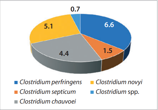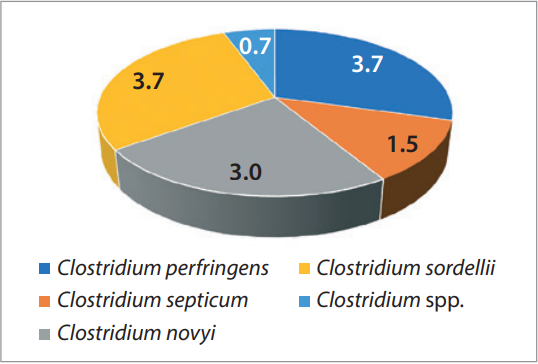 Prevalence of C. perfringens was established – 17.5%, followed by C. tertium – 13.1%, C. sordellii – 11.7%, C. chauvoei – 11.0%, C. novyi – 9.5%, P. bifermentans and C. butyricum – 8.0%, C. sporogenes – 6.6%, Clostridium spp. – 5.0%, C. septicum – 3.0%, C. cadaveris – 2.2%, C. sphenoides and C. cochlearium – 1.5% each, the smallest proportion is made up of C. sartagoforme and C. paraputrificum isolates – 0.7%.