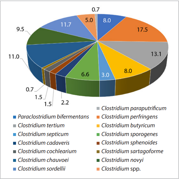 As a result of the studies, 137 Clostridium isolates were recovered and identified: Paraclostridium bifermentans, Clostridium perfringens, Clostridium tertium, Clostridium butyricum, Clostridium septicum, Clostridium sporogenes, Clostridium cadaveris, Clostridium sphenoides, Clostridium cochlearium, Clostridium sartagoforme, Clostridium chauvoei, Clostridium novyi, Clostridium sordellii, Clostridium paraputrificum, Clostridium spp.