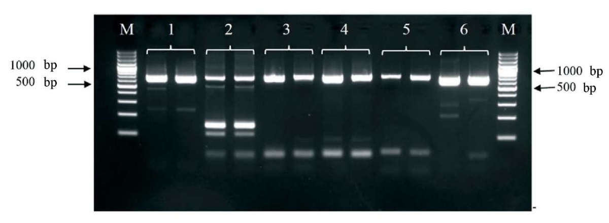 Fig. 1. Electropherogram of the PCR products using different combinations of primers for amplification Newcastle disease virus LaSota strain genome fragment. Each combination is given in duplicate. The numbers indicate the lanes with the following primer combinations: 1 – LASF815 – LASR1500; 2 – LASF1632 – LASR2337; 3 – LASF2086 – LASR2793; 4 – LASF2318 – LASR3026; 5 – LASF2598 – LASR3296; 6 – LASF107 – LASR800. М – molecular weight marker GeneRuler 100 bp Plus DNA Ladder (Thermo Fisher Scientific) fragment length is 100 bp