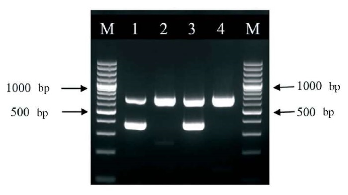 Fig. 2. Electropherogram of PCR products from rabies virus-positive samples and rabies virus-negative samples. The numbers 1 and 3 indicate the lanes with rabies virus-positive samples; the numbers 2 and 4 indicate the lanes with rabies virus-negative samples. М – molecular weight marker GeneRuler 100 bp Plus DNA Ladder (Thermo Fisher Scientific) fragments length is 100 bp