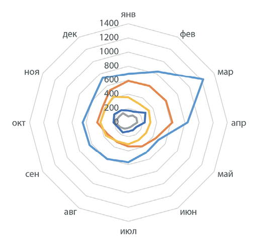 Рис. 3. Сезонность заболеваемости основных видов животных,