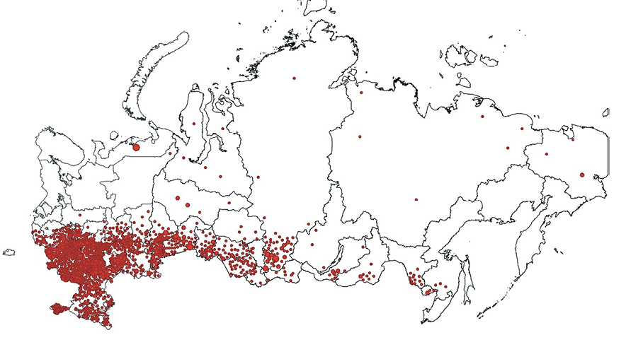 Fig. 5. Distribution of rabies outbreaks reported in 2013–2024 by agroecological provinces of the Russian Federation