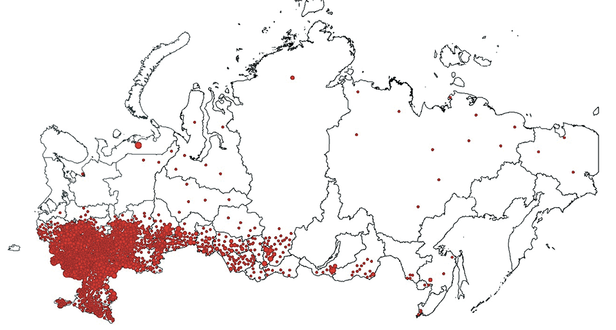 Анализ данных о локализации неблагополучных по бешенству пунктов за данный период показывает, что современный нозоареал бешенства затрагивает территорию, которая охватывает большую часть регионов Российской Федерации. Без учета четырех новых регионов за последние 12 лет случаи бешенства были выявлены в 78 субъектах страны, в 39 из них вспышки бешенства регистрировались ежегодно. Высокая инцидентность и плотность пространственного расположения вспышек бешенства в новых регионах, исходя из данных наблюдения за два последних года, позволяет отнести данные территории также к зоне со стабильно высоким уровнем эпизоотического неблагополучия.