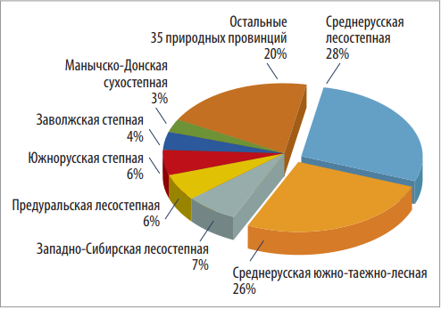 Из 42 природно-сельскохозяйственных провинций, в которых выявлялось бешенство в 2013–2024 гг., свыше 50% случаев заболеваний приходилось на две из них – Среднерусскую лесостепную и Среднерусскую южно-таежно-лесную (рис. 5).