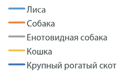 Установлено, что наиболее часто бешенство выявлялось среди лисиц, собак, кошек, крупного рогатого скота и енотовидных собак (рис. 2).