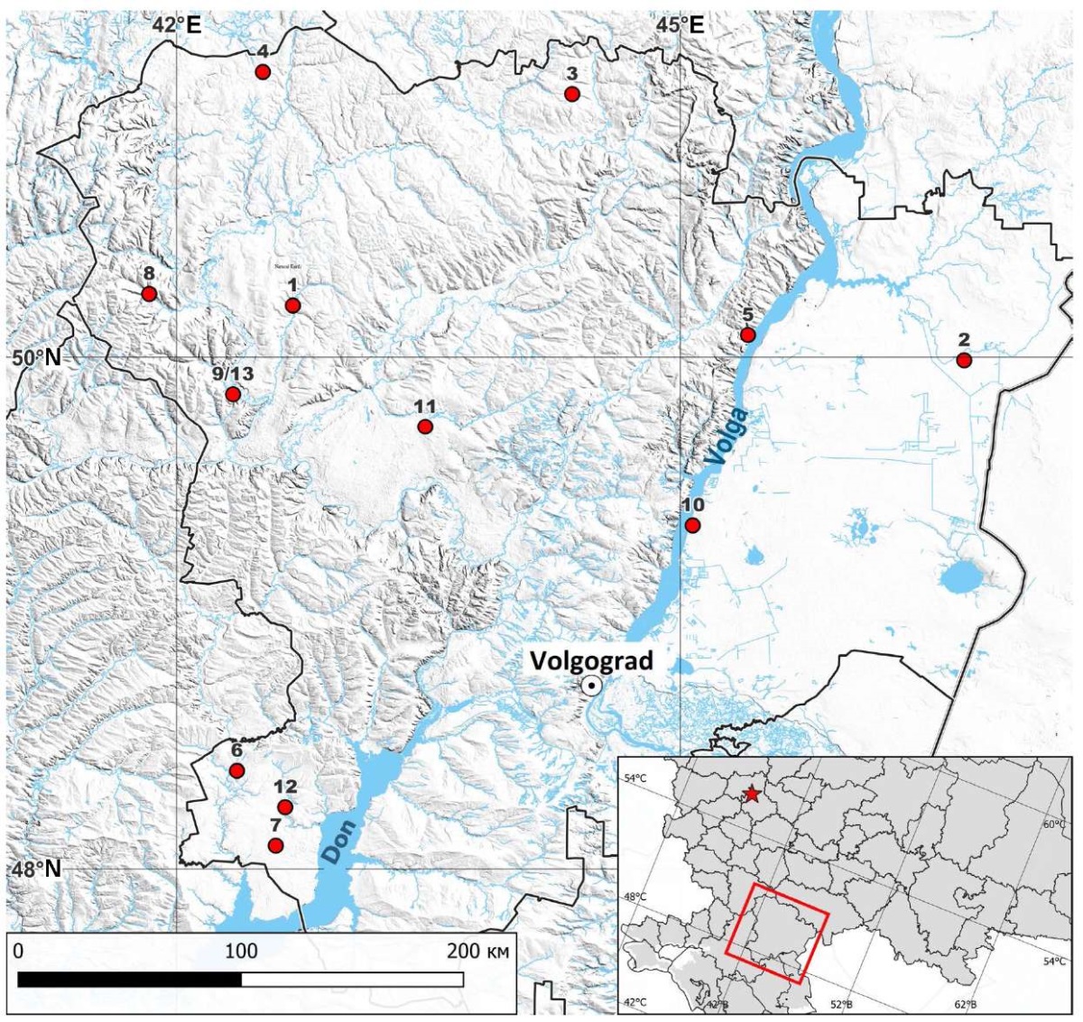 A total of 13 RABV isolates collected from animals in the Volgograd Oblast in 2018–2021 were studied (Table 1, Fig. 1).