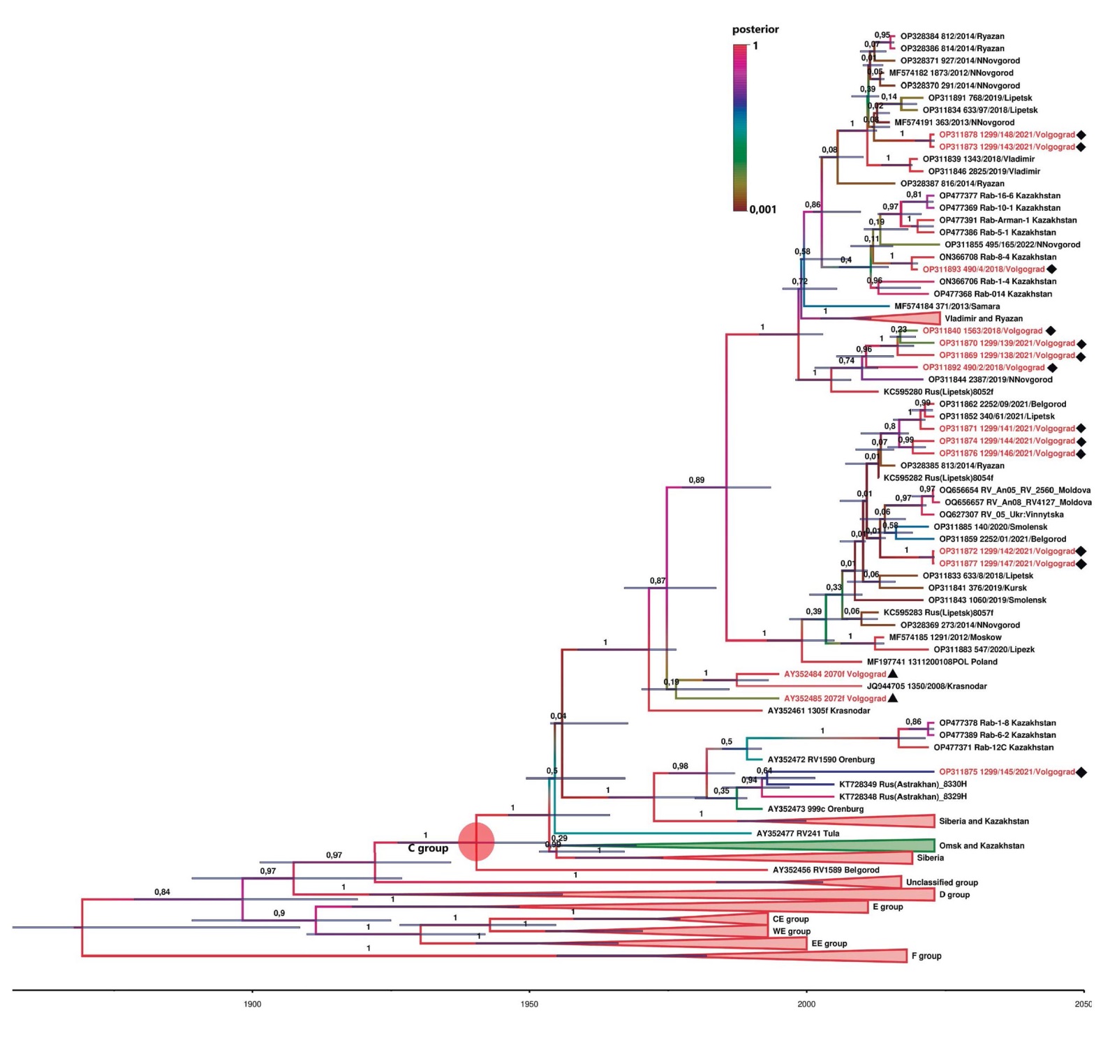 Fig. 2. Phylogenetic tree constructed using the full-length nucleotide sequence of RABV N gene and a strict molecular clock algorithm. Isolates collected from animals in the Volgograd Oblast are highlighted in red. Numbers (0–1) indicate posterior probability values for specific groups; the same parameter is indicated with the color of branches (see color scale for interpretation). The horizontal timeline at the bottom shows the estimated years of the most recent common ancestor for this or that group, with blue bars at nodes representing 95% confidence intervals for this value. The pink circle marks the most recent common ancestor of genetic group C. Black diamonds denote the studied isolates, while triangles represent two previously characterized isolates from the Volgograd Oblast
