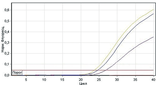 Анализ и интерпретация результатов. Рекомендуемые параметры ПЦР-анализа для каналов Green/FAM и Red/Cy5 тождественны: установка динамического фона, корректировка уклона, устранение выбросов на 10%, линейная шкала и пороговое значение, которое составляет 0,05 (рис. 2). Результаты интерпретируются на основании наличия или отсутствия пересечения кривой флуоресценции с пороговой линией, что соответствует наличию или отсутствию на каналах Green/FAM и Red/Cy5 значений пороговых циклов амплификации (Ct) в соответствующих графах таблиц результатов, отображаемых амплификатором.