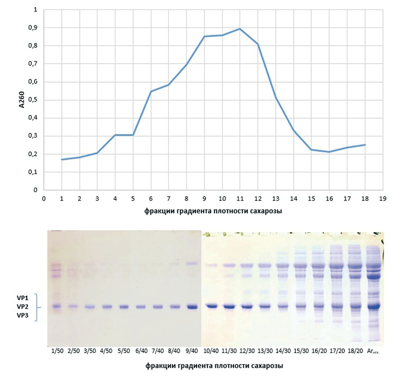 При фракционировании антигена ультрацентрифугированием в градиенте плотности сахарозы 20–50% основная масса 146S-частиц скапливалась на границе раздела 30 и 40% слоев сахарозы в виде опалесцирующей полосы. Отобранные по 1 мл фракции градиента анализировали спектрофотометрически при длине волны 260 нм для построения седиментационного профиля AgПЦ SAT2/XIV (рис. 3А) и при электрофоретическом разделении белковых молекул в 12%-м полиакриламидном геле (рис. 3В).
