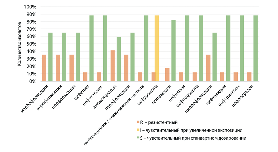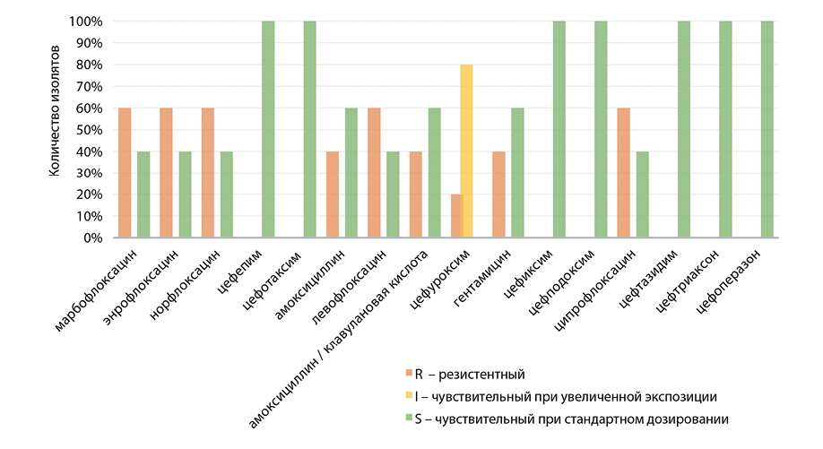 Резистентность к фторхинолонам наблюдали у 60,0% изолятов P. mirabilis (n = 10), выделенных из проб раневого экссудата (рис. 5). Все изоляты были восприимчивы к препаратам из группы цефалоспоринов, за исключением цефуроксима, к которому чувствительность проявили 80% изолятов только при увеличенной экспозиции. Устойчивость к амоксициллину и его комбинации с клавулановой кислотой наблюдали у 40% изолятов, полученных из фекалий и раневого экссудата; 40% изолятов, выделенных из раневого отделяемого, были резистентны к гентамицину. В целом стоит отметить, что препараты из группы цефалоспоринов эффективны в отношении P. mirabilis.