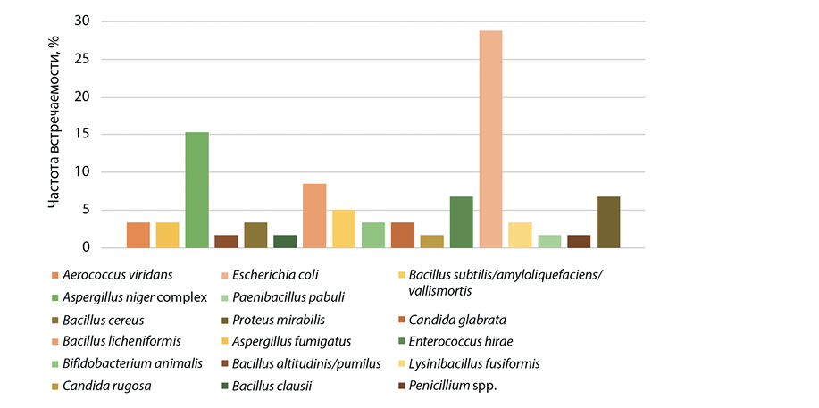 Значительно меньшее видовое разнообразие оппортунистических и патогенных микроорганизмов идентифицировано в пробах фекалий крупного рогатого скота (n = 59): E. coli – 28,81%, Aspergillus niger complex – 15,25%, Bacillus licheniformis – 8,47%, P. mirabilis и Enterococcus hirae – по 6,78%, отмечено присутствие и других представителей грибковой микробиоты (рис. 2).