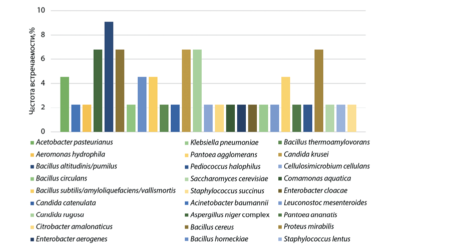 Рис. 3. Видовое разнообразие микроорганизмов, выделенных из проб корма (n = 44)